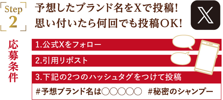 2.キャンペーン期間中に秘密のシャンプー公式アカウントより投稿される本キャンペーンの対象ポストを、「#予想ブランド名は〇〇〇〇」「#秘密のシャンプー」の指定ハッシュタグを付けて、引用リポストすると応募完了です。(〇〇〇〇部分にはクイズの答えを入れてください)