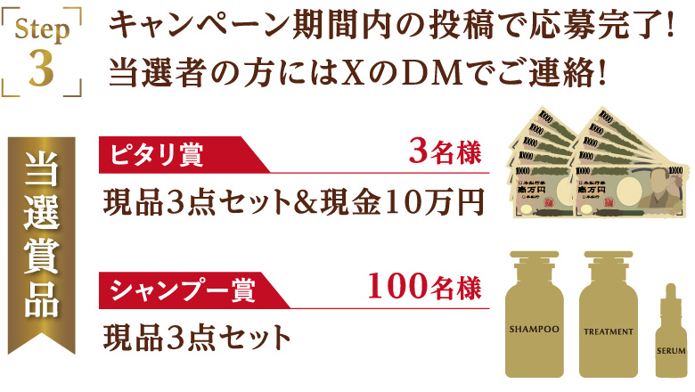 公開された商品の特徴や成分などから「ブランド名」を予測してXへ投稿いただくと、見事正解された方の中から抽選で、3名様にピタリ賞として新ブランド現品3点セットと現金10万円、100名様にシャンプー賞として新ブランド現品3点セットをプレゼントいたします!